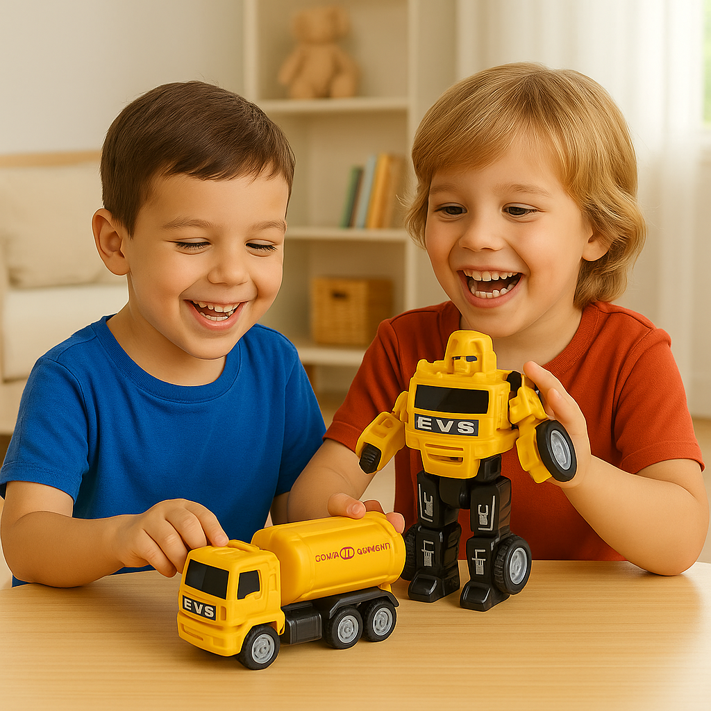 Ein kräftiger Baustellen-Truck verwandelt sich mit wenigen Handgriffen in einen mutigen Roboter – bereit für jedes Abenteuer, das die Fantasie hergibt!