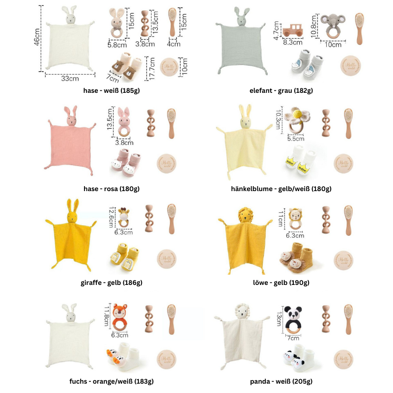 Dieses Geschenkset vereint hochwertige Produkte, die Babys Komfort und Spaß bieten, und gleichzeitig den Eltern den Alltag erleichtern. Mit seiner stilvollen Präsentation und den durchdachten Inhalt ist es ein Geschenk, das garantiert gut ankommt.