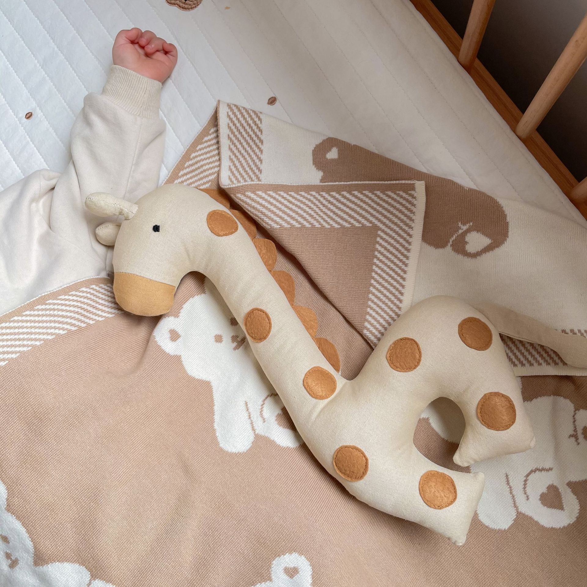 - Form: Eine niedliche Giraffe mit langen Beinen und weichen Proportionen, ideal für Babys zum Kuscheln.